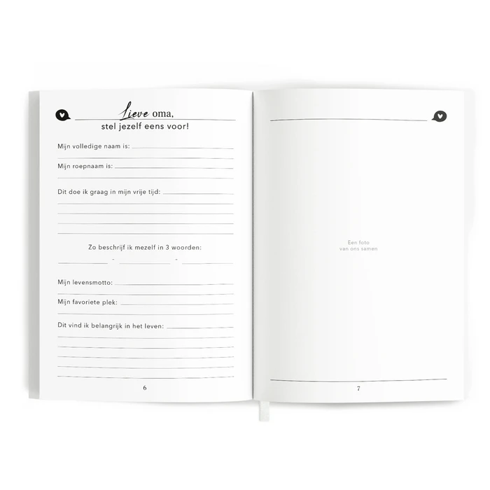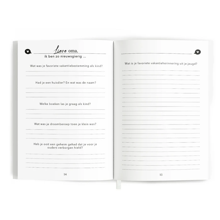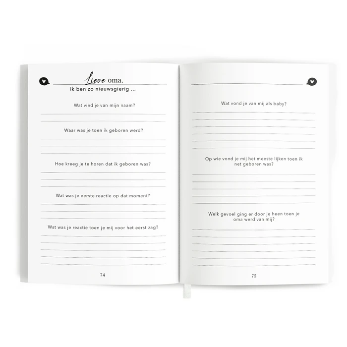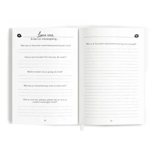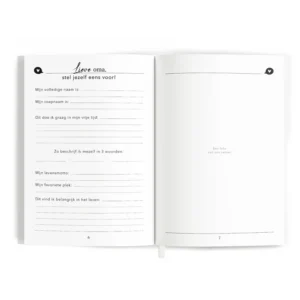 Met het ‘lieve oma, ik ben zo nieuwsgierig..’ invulboek geef je je oma een prachtig en waardevol boek cadeau. Geef het aan haar en krijg het vol mooie herinneringen en verhalen terug. Op deze manier kun je alles te weten komen over je oma en krijg je de kans om haar nog beter en op een andere manier te leren kennen. Waar je normaal nooit over praat samen en wat misschien ook niet altijd even gemakkelijk is om zomaar naar te vragen komt aan bod in dit mooie invulboek. Met dit boek geef je aan dat je nieuwsgierig bent naar alles wat zij heeft meegemaakt, van haar kindertijd tot aan nu. Zo kan ze vertellen over al haar herinneringen van vroeger, over haarzelf als persoon, over jou en jullie band en ten slotte krijgt ze de mogelijkheid om een brief te schrijven. Het boek bestaat uit maar liefst 194 vragen en opdrachten. Dit zijn genoeg vragen om je oma beter te leren kennen, maar is voor haar niet overdadig doordat het gemakkelijk invulbaar is. ‘Hoe was je jeugd in één woord?’ tot ‘welk snoep vond je het lekkerst toen je kind was?’ en ‘wat zou je graag tegen je jongere zelf willen zeggen?’ ‘wat waren de moeilijkste momenten in je leven?’, ‘waarin lijken wij op elkaar?’ Zijn enkele vragen die je terug vindt in het boek. Ook is er plek voor foto’s van vroeger en nu en briefjes of tickets van mooie herinneringen.
