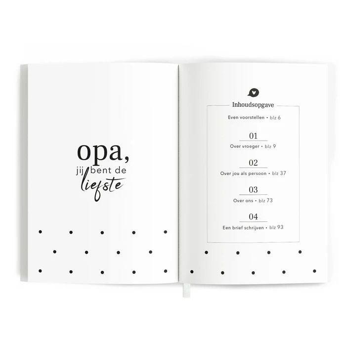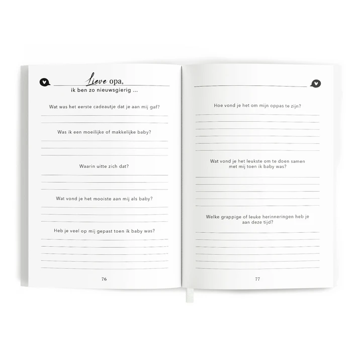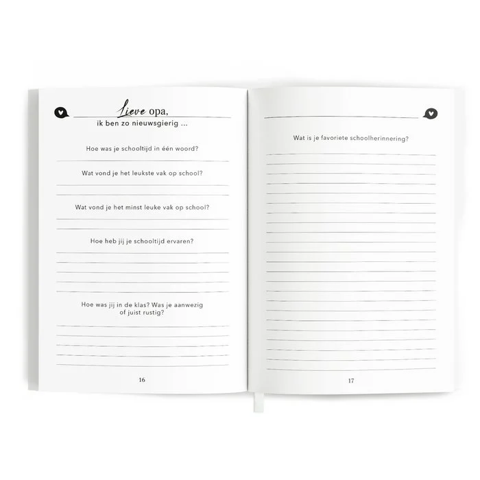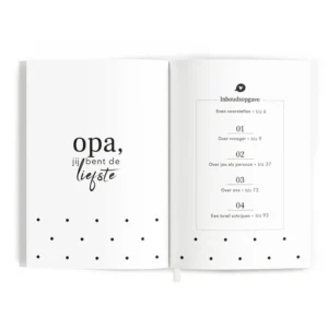 Met het ‘lieve opa, ik ben zo nieuwsgierig..’ invulboek geef je je opa een prachtig en waardevol boek cadeau. Geef het aan hem en krijg het vol mooie herinneringen en verhalen terug. Op deze manier kun je alles te weten komen over je opa en krijg je de kans om hem nog beter en op een andere manier te leren kennen. Waar je normaal nooit over praat samen en wat misschien ook niet altijd even gemakkelijk is om zomaar naar te vragen komt aan bod in dit mooie invulboek. Met dit boek geef je aan dat je nieuwsgierig bent naar alles wat hij heeft meegemaakt, van zijn kindertijd tot aan nu. Zo kan hij vertellen over al zijn herinneringen van vroeger, over zichzelf als persoon, over jou en jullie band en ten slotte krijgt hij de mogelijkheid om een brief te schrijven. Het boek bestaat uit maar liefst 194 vragen en opdrachten. Dit zijn genoeg vragen om je opa beter te leren kennen, maar is voor hem niet overdadig doordat het gemakkelijk invulbaar is. ‘Hoe was je jeugd in één woord?’ tot ‘welk snoep vond je het lekkerst toen je kind was?’ en ‘wat zou je graag tegen je jongere zelf willen zeggen?’ ‘wat waren de moeilijkste momenten in je leven?’, ‘waarin lijken wij op elkaar?’ Zijn enkele vragen die je terug vindt in het boek. Ook is er plek voor foto’s van vroeger en nu en briefjes of tickets van mooie herinneringen.