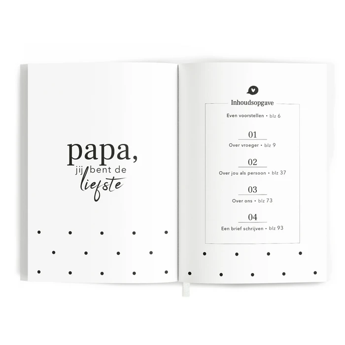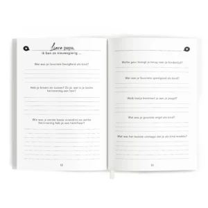 Met het ‘lieve papa, ik ben zo nieuwsgierig..’ invulboek geef je je opa een prachtig en waardevol boek cadeau. Geef het aan hem en krijg het vol mooie herinneringen en verhalen terug. Op deze manier kun je alles te weten komen over je papa en krijg je de kans om hem nog beter en op een andere manier te leren kennen. Waar je normaal nooit over praat samen en wat misschien ook niet altijd even gemakkelijk is om zomaar naar te vragen komt aan bod in dit mooie invulboek. Met dit boek geef je aan dat je nieuwsgierig bent naar alles wat hij heeft meegemaakt, van zijn kindertijd tot aan nu. Zo kan hij vertellen over al zijn herinneringen van vroeger, over zichzelf als persoon, over jou en jullie band en ten slotte krijgt hij de mogelijkheid om een brief te schrijven. Het boek bestaat uit maar liefst 194 vragen en opdrachten. Dit zijn genoeg vragen om je papa beter te leren kennen, maar is voor hem niet overdadig doordat het gemakkelijk invulbaar is. ‘Hoe was je jeugd in één woord?’ tot ‘welk snoep vond je het lekkerst toen je kind was?’ en ‘wat zou je graag tegen je jongere zelf willen zeggen?’ ‘wat waren de moeilijkste momenten in je leven?’, ‘waarin lijken wij op elkaar?’ Zijn enkele vragen die je terug vindt in het boek.